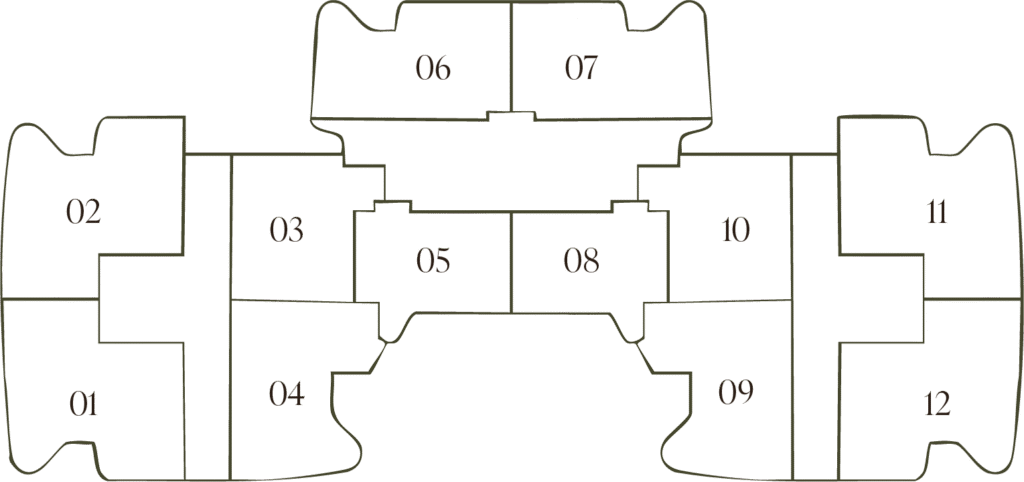 Tres torres independientes y acopladas que producen 8 residencias esquineras por piso con seis ascensores.